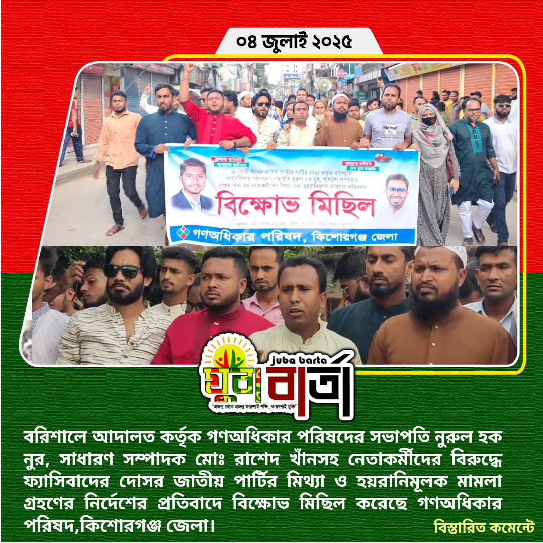 ‘বিপ্লবীদের নামে মামলা হচ্ছে কাদের ইশারায়’ প্রশ্ন রেখে গণঅধিকার পরিষদের উচ্চতর পরিষদ সদস্য ও গণমাধ্যম সমন্বয়ক আবু হানিফ বলেছেন, বরিশালে গণঅধিকার পরিষদের সভাপতি নুরুল হক, সাধারণ সম্পাদক রাশেদ খানসহ ২৫ জন নেতাকর্মীর নামে মামলা নিতে আদালত যে নির্দেশ দিয়েছেন আমরা তার নিন্দা ও প্রতিবাদ জানাচ্ছি। তিনি বলেন, ‘জুলাই গণঅভ্যুত্থান না হলে এ দেশের মানুষ ফ্যাসিবাদ থেকে মুক্তি পেত না। সেই জুলাই গণঅভ্যুত্থানে যারা সামনে থেকে নেতৃত্ব দিয়েছেন, জনগণ মুক্ত করার জন্য পুলিশের গুলির সামনে বুক পেতে দিয়েছিলেন তাদের মধ্যে অন্যতম নুরুল হক নুর। এ জুলাই গণঅভ্যুত্থানের নেতাদের নামে আদালত কিভাবে মিথ্যা মামলার নেয়ার নির্দেশ দেন সেটা বোধগম্য নয়। এই বিপ্লবীদের নামে মামলা হচ্ছে কাদের ইশারায় আমরা জানতে চাই। শুক্রবার (৪ জুলাই) বিকেলে গণঅধিকার পরিষদের সভাপতি নুরুল হক নুর, সাধারণ সম্পাদক মো: রাশেদ খাঁনসহ নেতাকর্মীদের বিরুদ্ধে ফ্যাসিবাদের দোসর জাতীয় পার্টির মিথ্যা ও হয়রানিমূলক মামলা গ্রহণে আদালতের নির্দেশের প্রতিবাদে সংগঠনটির কিশোরগঞ্জ শাখা আয়োজিত বিক্ষোভ মিছিল শেষে সংক্ষিপ্ত বক্তব্যে তিনি এসব কথা বলেন। এ মিছিলটি জেলা কার্যালয় থেকে শুরু হয়ে মুক্তমঞ্চের সামনে গিয়ে সংক্ষিপ্ত সমাবেশে মিলিত হয়।